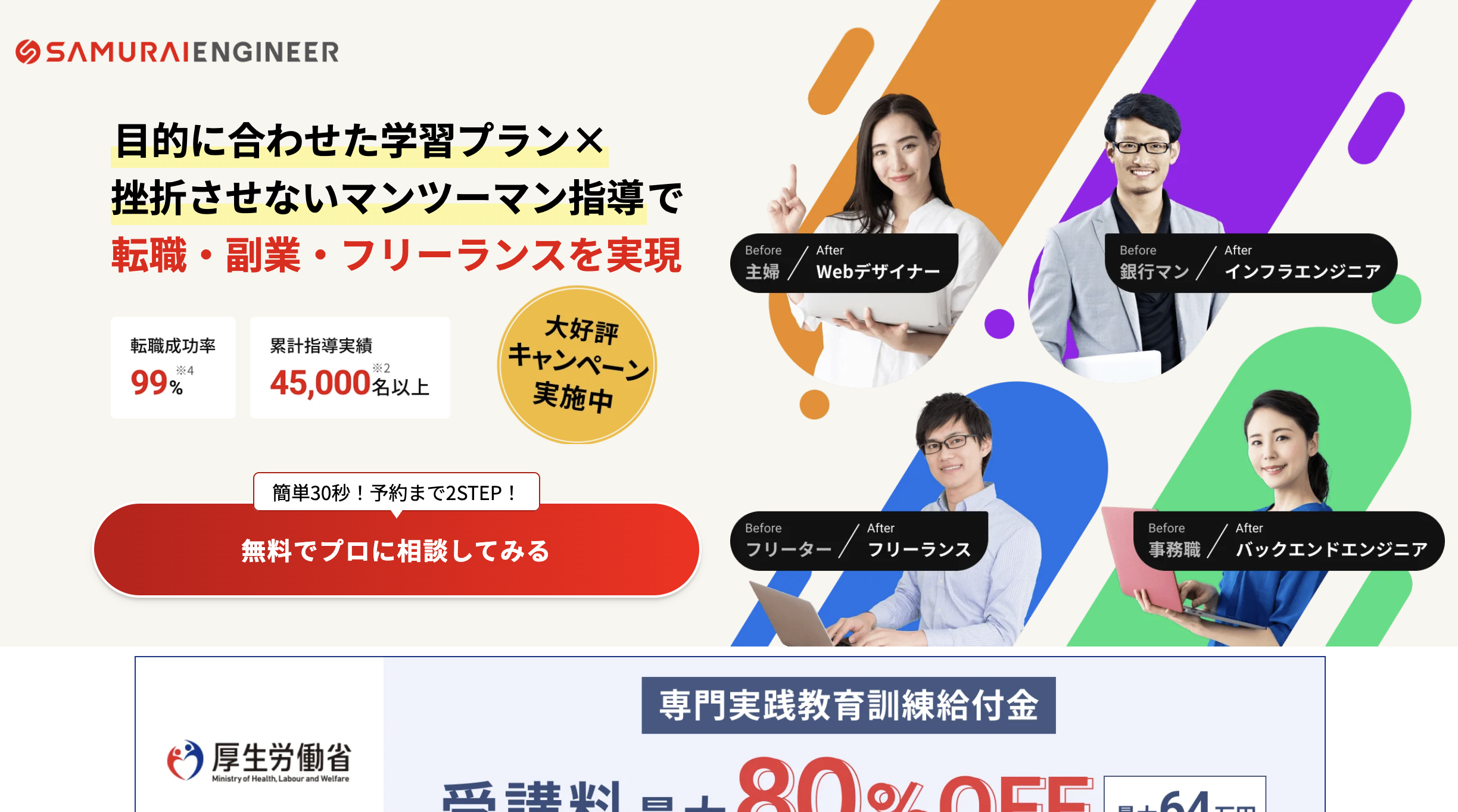 この記事では、現役エンジニアの専属マンツーマン指導で人気の 侍エンジニアの特徴・料金・評判・向いている人 までを詳しく紹介します。