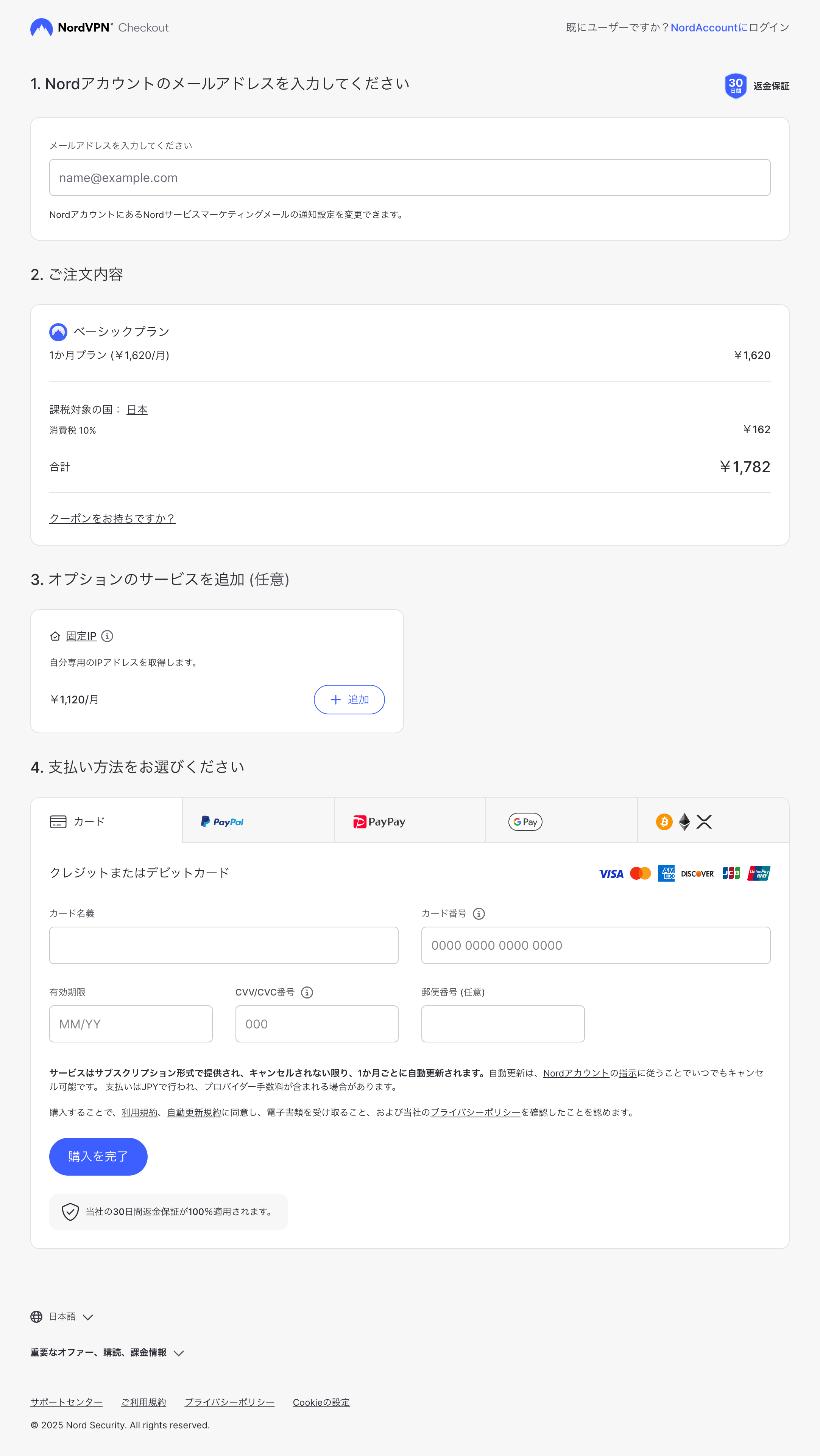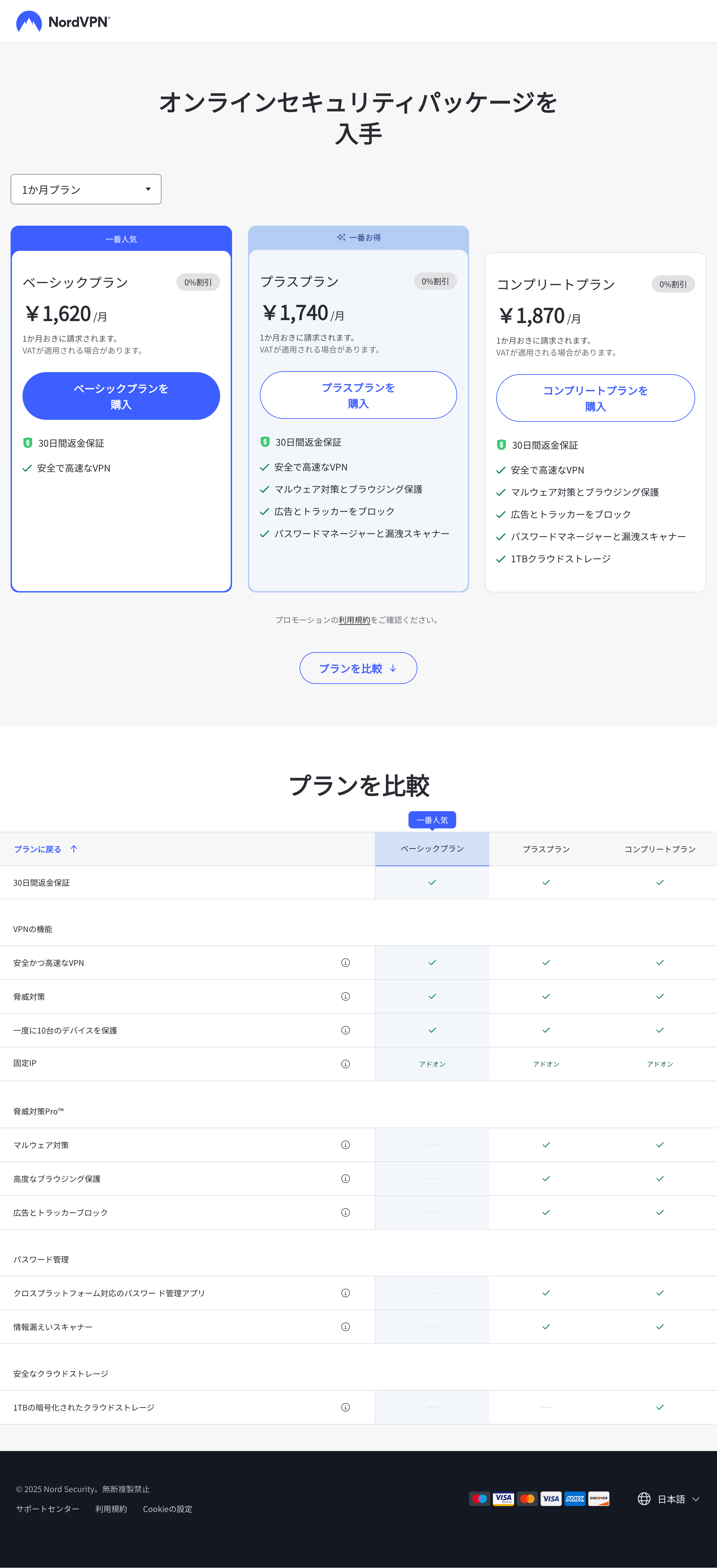 日本語対応の公式ページからプランを選びます。1か月/1年/2年の契約期間があり、長期プランほどお得です。